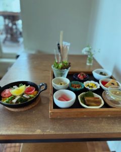 両メニューには付く薬膳お野菜プレートが付きます。お野菜の副菜メニュー、グリーンサラダ+ベジドレッシングで栄養満点のプレートです。